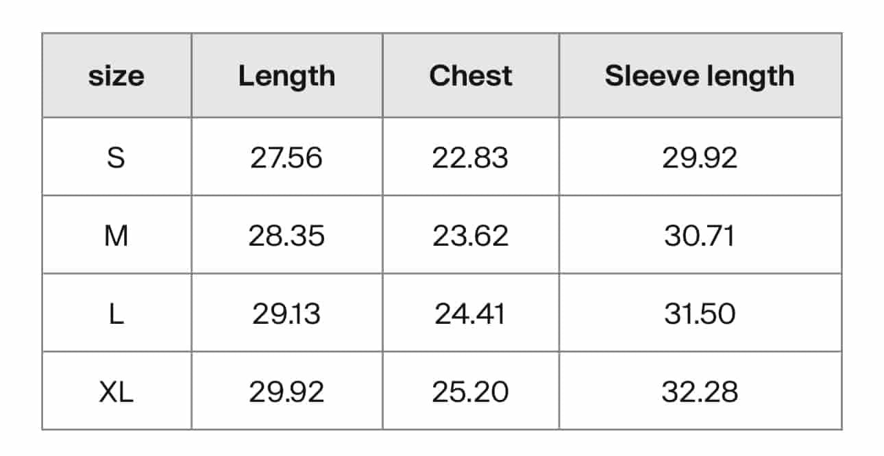 | Sleeve length | 29.9 | 76 | 30.7 | 78 | 31.5 | 80 | 32.3 | 82 |
